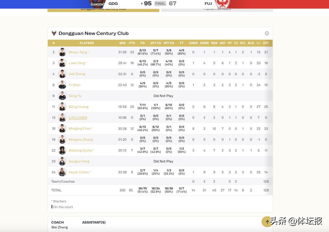最終,東莞新世紀女籃和日本富士通紅浪女籃均以全勝戰績會師決賽。面對實力不俗的對手,東莞新世紀女籃展現出默契的團隊配合,並且全場三分球命中率高達50%,沒有給對手機會,早早鎖定勝局,成功捧起冠軍獎盃。