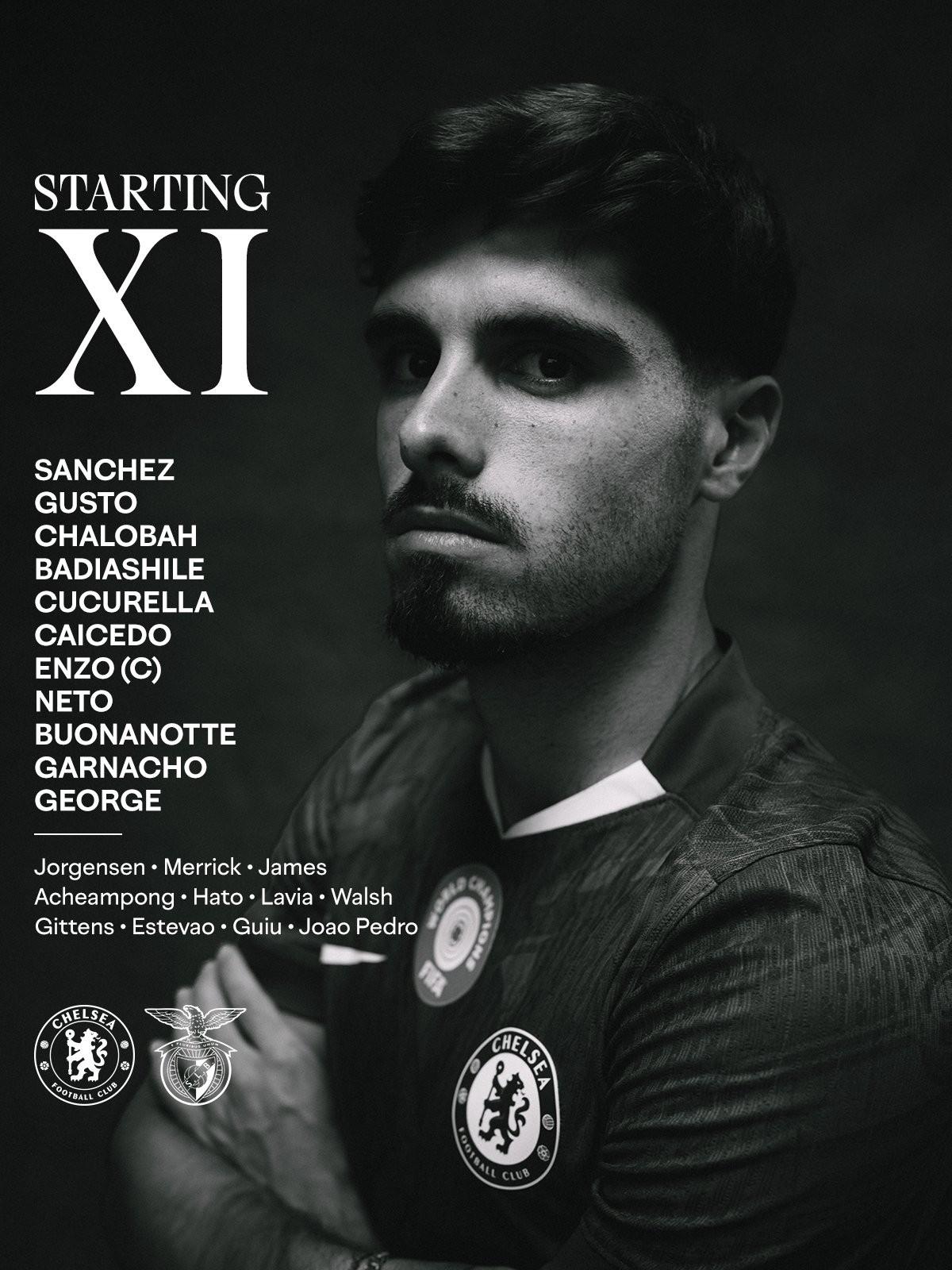 切爾西首發:1-桑切斯、27-古斯托、23-查洛巴、5-巴迪亞西勒、3-庫庫雷利亞、25-凱塞多、8-恩佐、7-內託、40-博納諾特、49-加納喬、32-喬治