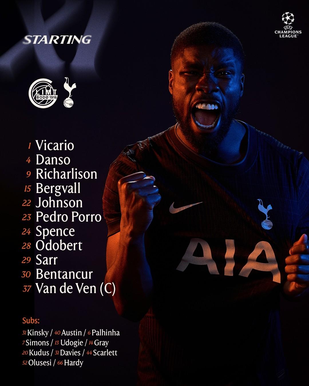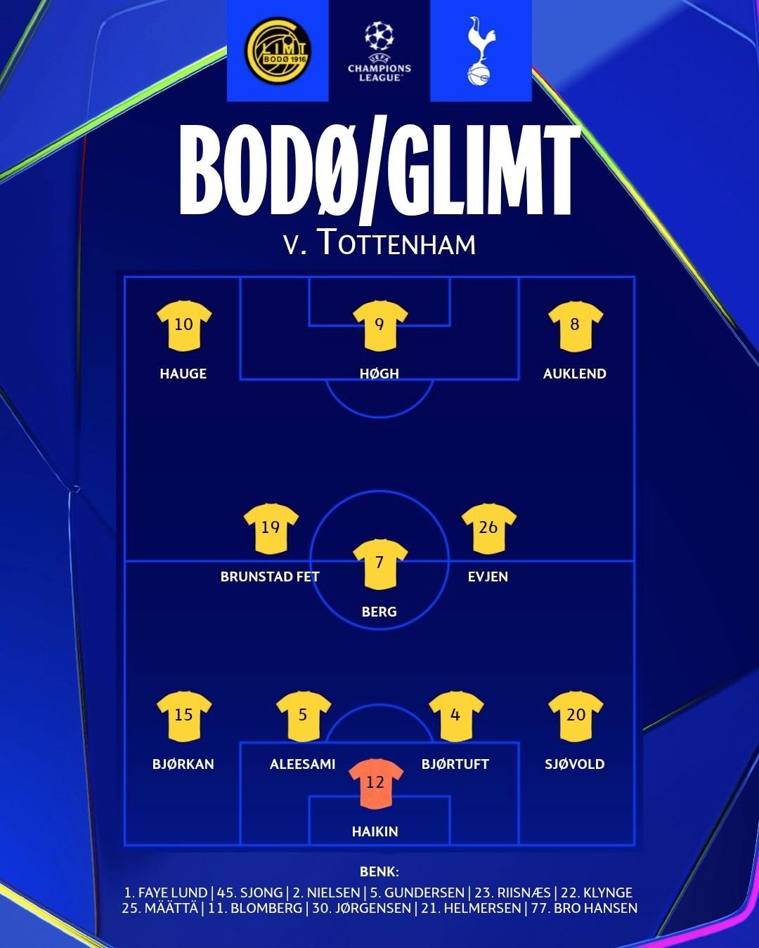 北京時間10月1日03:00,歐冠聯賽階段的一場對決,博德閃耀坐鎮主場,迎戰熱刺。賽前,雙方的陣容公佈如下: