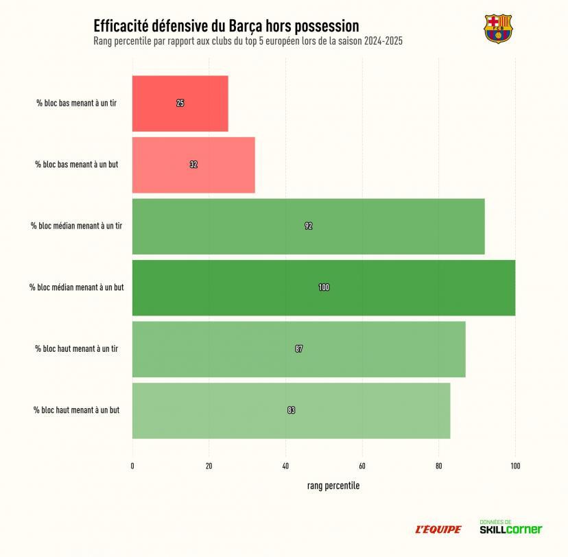 根據SkillCorner的數據,在高位防守導致的丟球方面,巴塞羅那的表現優於歐洲五大聯賽中83%的球隊。