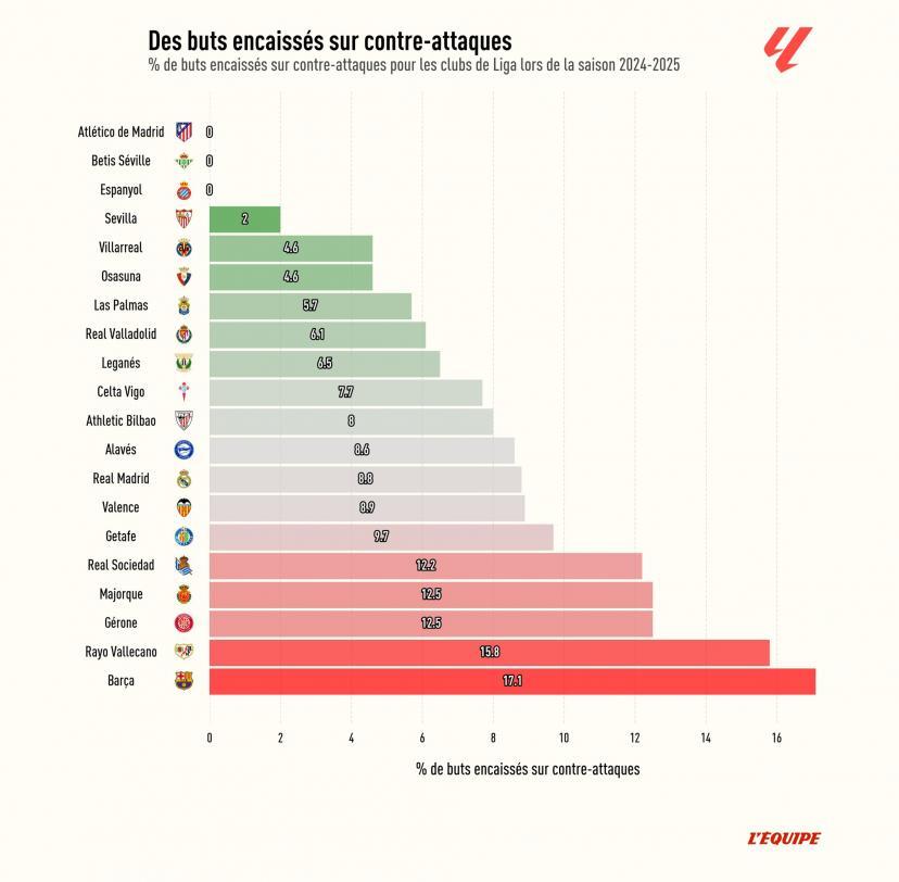 讓我們聚焦上賽季的數據,畢竟本賽季的樣本量仍然不足。根據Opta的數據,巴塞羅那是上賽季西甲因反擊丟球佔比最高的西班牙俱樂部(17.1%)。更廣泛地說,四分之一的被射門機會來自這些情況。