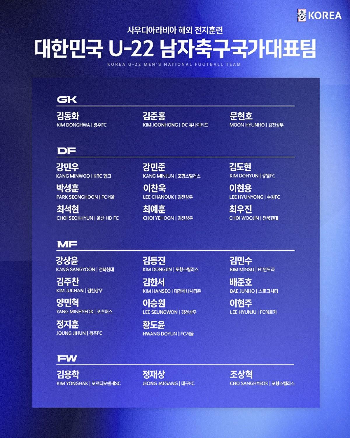 北京時間10月1日,韓國足協公佈了韓國U22的大名單,其中梁民革、裴峻浩領銜,7名海外球員入選,本月韓國U22將於沙特U22進行兩場比賽。