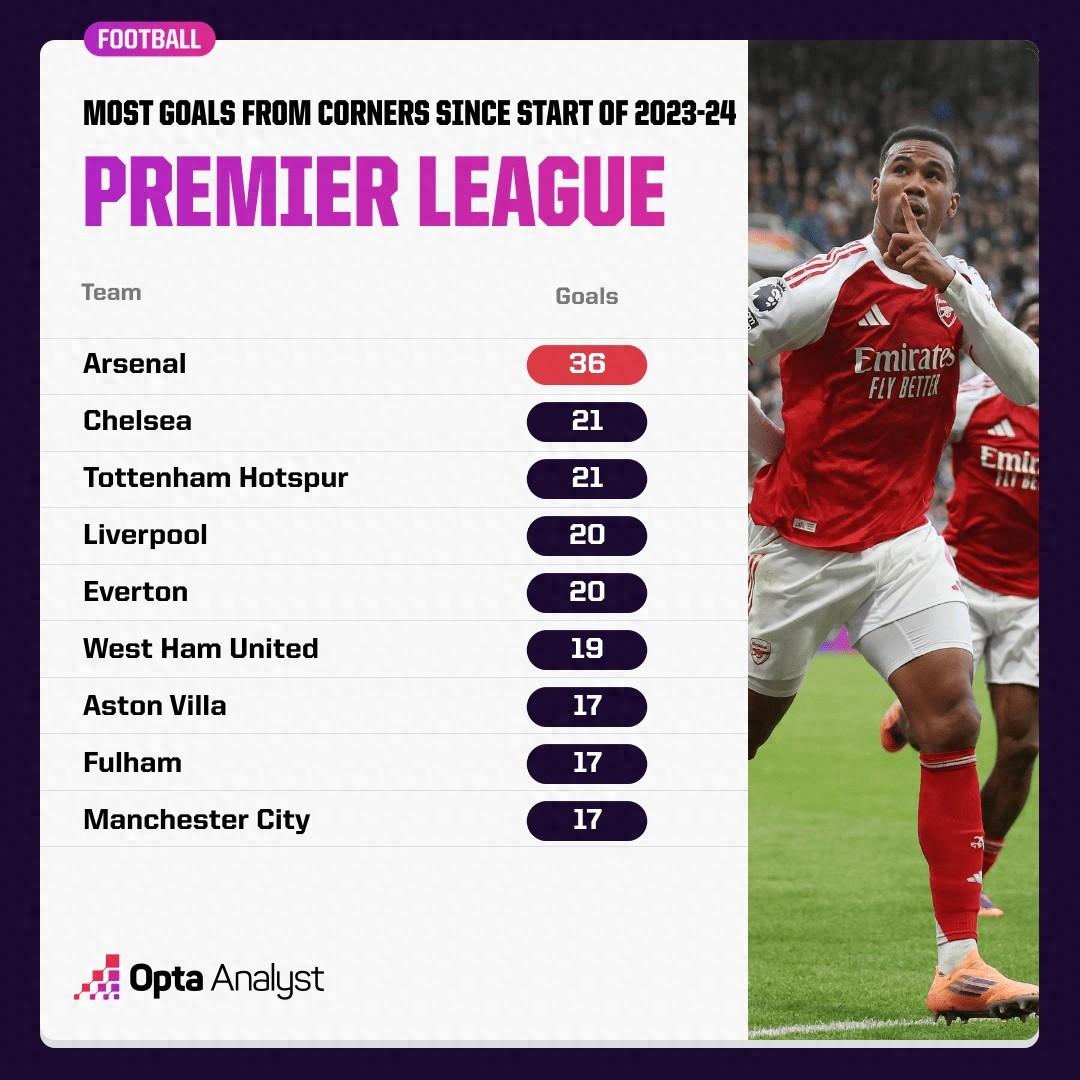 據統計,自2023-24賽季開始以來,阿森納在英超中通過角球共攻入36球,比其他任何英超球隊都要多出至少15球。在這段時間內,只有切爾西(21球)、托特納姆熱刺(21球)、利物浦(20球)和埃弗頓(20球)通過角球打進20+球。