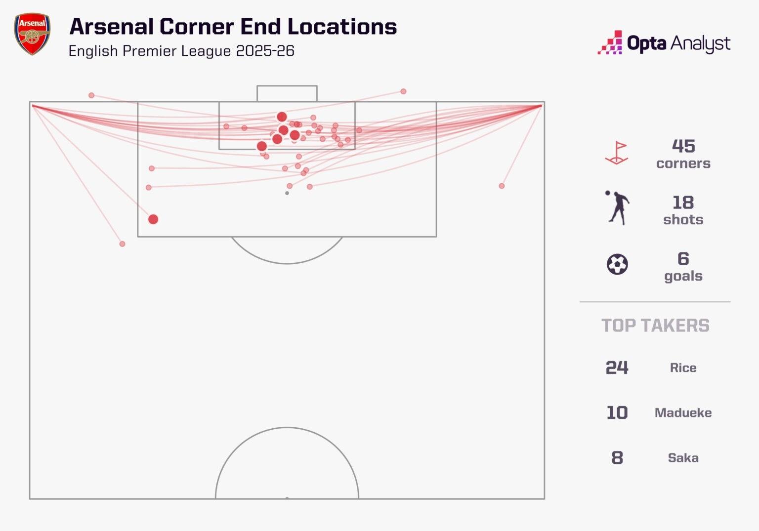 就本賽季而言,阿森納在前6輪英超比賽中總共獲得了45次角球,比其他任何球隊都多出至少4次,而賴斯一人就主罰24次。從這些角球中,阿森納完成18次射正,打進6球。