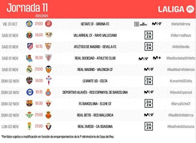 西甲官方公佈了第11輪比賽的開球時間,皇馬將在北京時間11月2日凌晨四點開球,巴薩將在11月3日凌晨1點半開球。