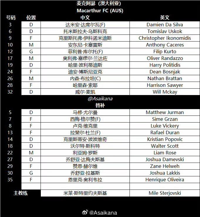 麥克阿瑟FC首發:12-庫爾託、3-達米恩-達席爾瓦、6-烏斯科克、19-波利蒂亞斯、32-麥凱、10-卡塞雷斯、17-蘭達佐、26-布拉坦、9-伊孔諾米蒂斯、24-博斯尼亞克、28-索耶