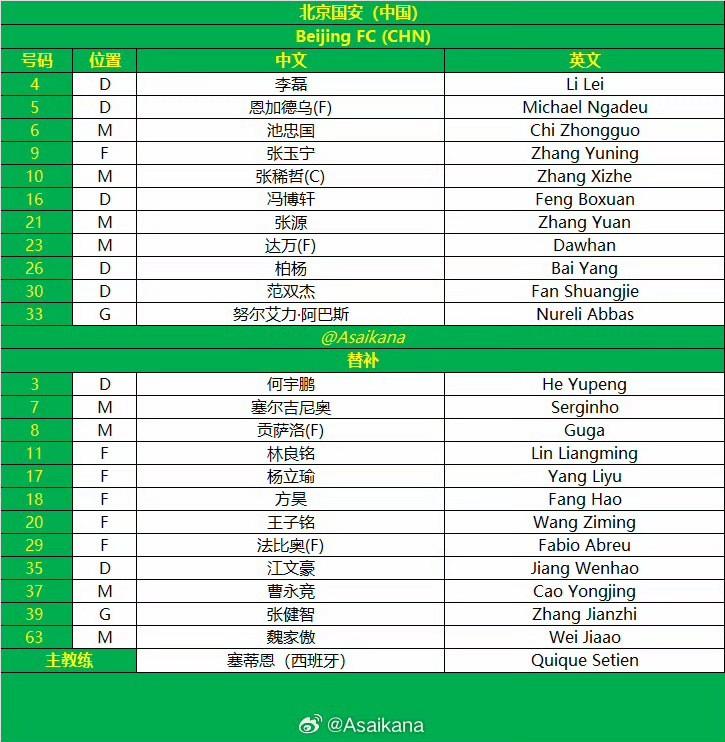 北京國安首發:33-努爾艾力、4-李磊、5-恩加德烏、30-範雙傑、26-柏楊、16-馮博軒、6-池忠國、10-張稀哲、21-張源、23-達萬、9-張玉寧