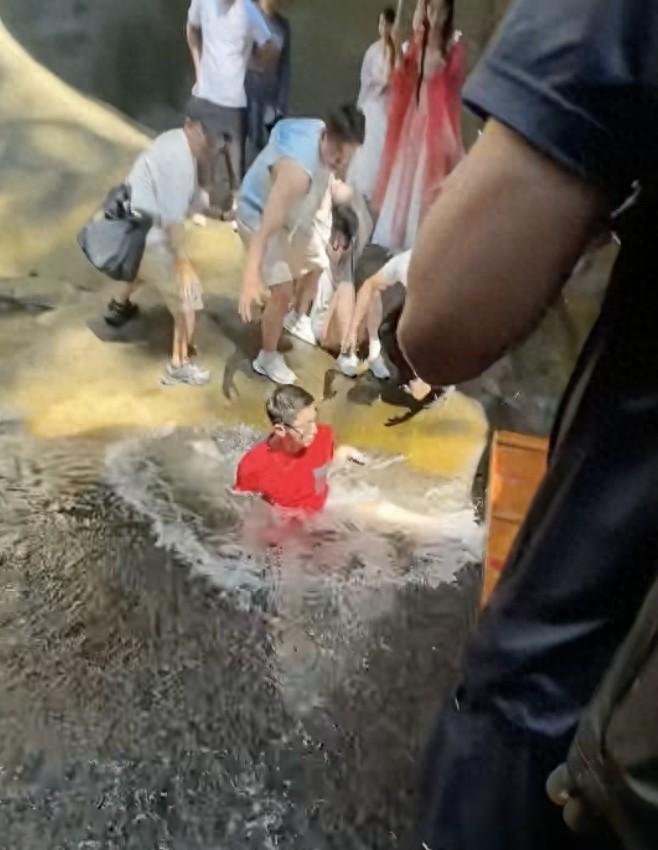 視頻顯示,張繼科穿着紅色短袖上衣以及黑色短褲,半蹲着用手機拍不遠處的一個瀑布,沒過幾秒,張繼科整個人突然落入水中,一旁的遊客紛紛伸手想要拉住他。