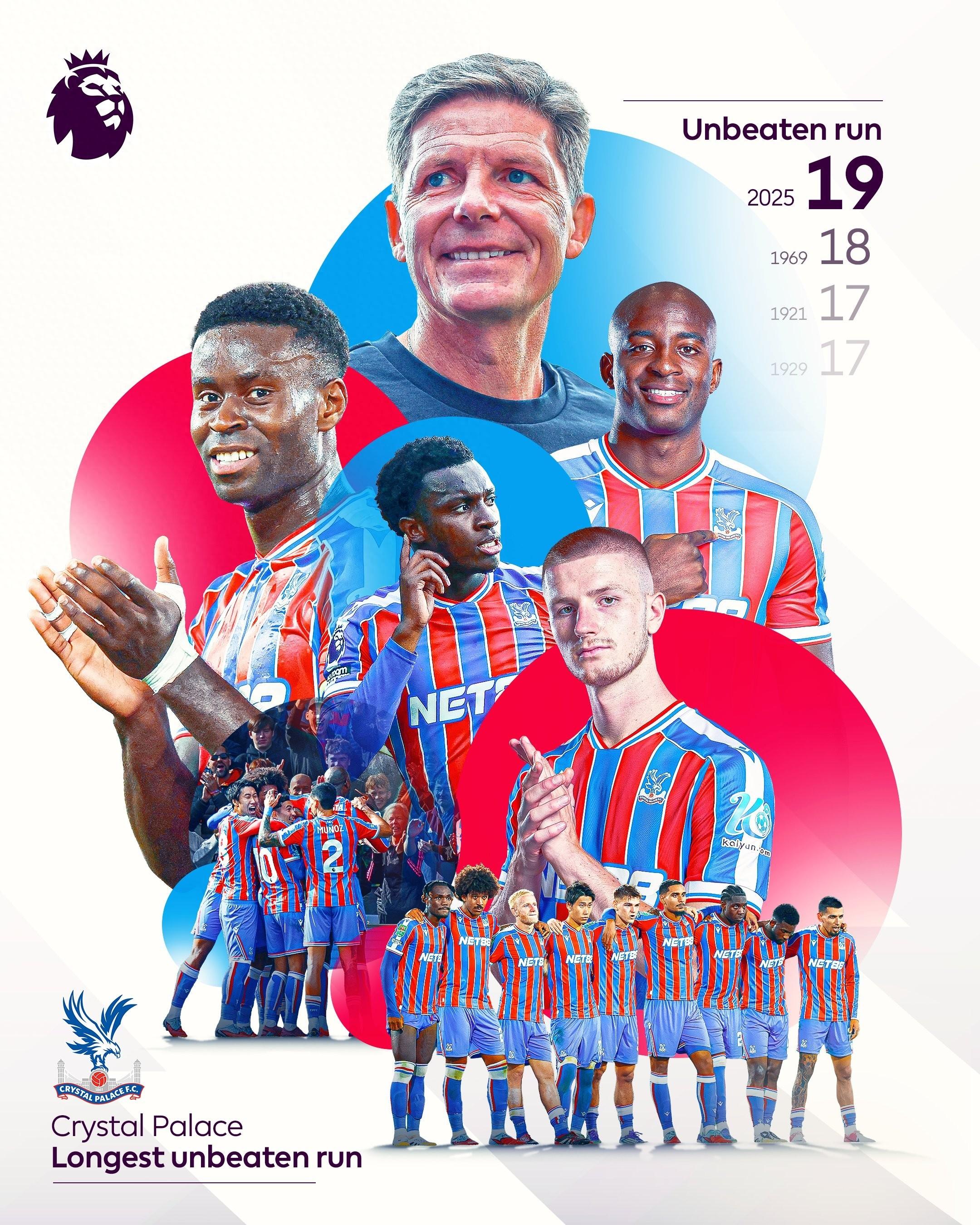 自今年4月17日,(上賽季)英超第29輪,客場0-5慘敗紐卡斯爾後,水晶宮至今19場正式比賽不敗,取得9勝10平戰績,刷新了球隊在1969年創造的連續18場不敗的紀錄。