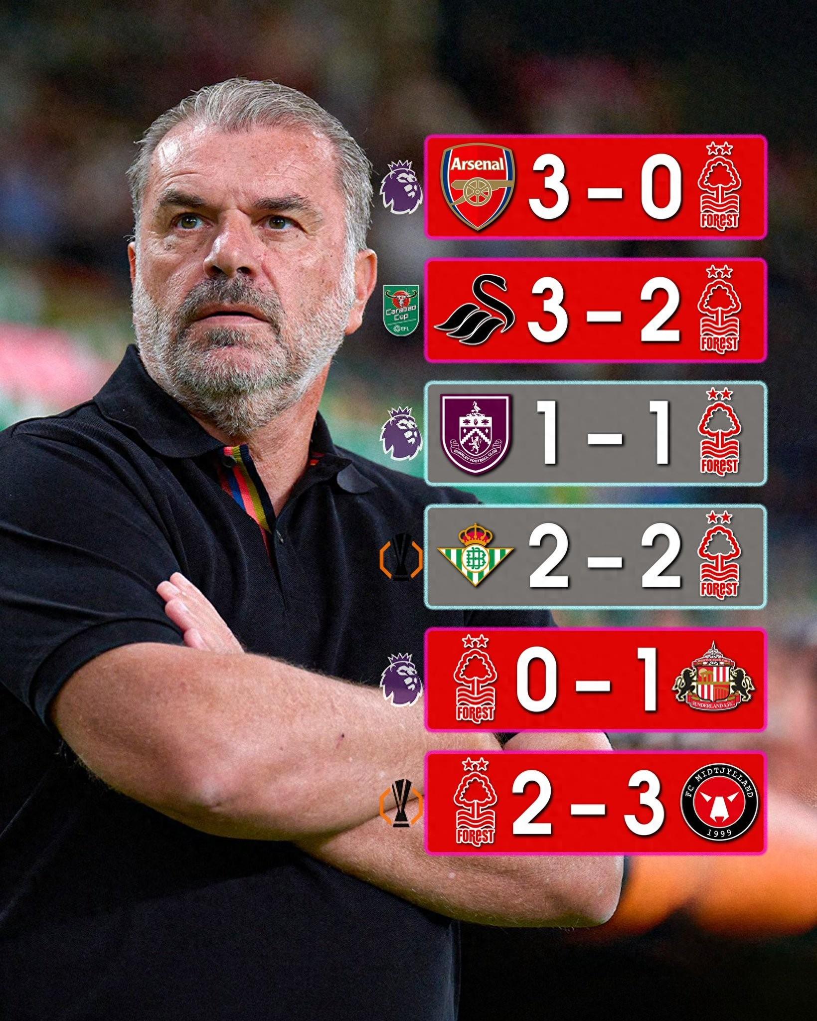 自北京時間9月9日,諾丁漢森林官方宣佈前熱刺主教練波斯特科格魯成爲一線隊新主帥以來,波斯特科格魯已帶隊出戰英超、英聯杯以及歐聯杯各項賽事中的6場比賽,取得2平4負的戰績,至今未嘗一勝。