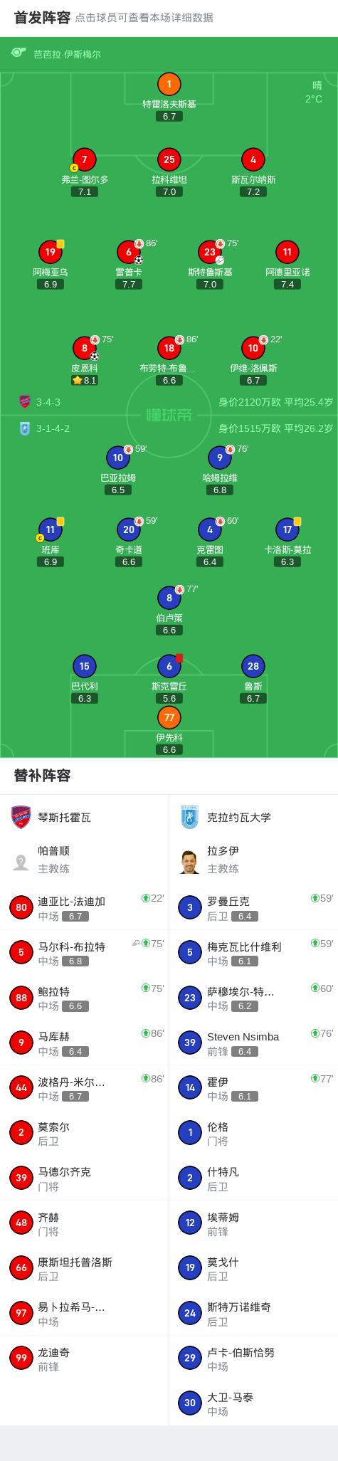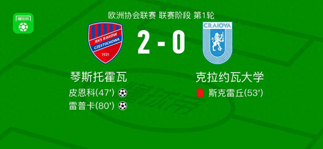 北京時間10月3日,歐洲協會聯賽聯賽階段第1輪展開較量,琴斯托霍瓦迎戰克拉約瓦大學。比賽開始後,琴斯托霍瓦逐漸掌控節奏,並在下半場由斯特魯斯基送出助攻,皮恩科將球送入對方球門,爲球隊取得領先。隨後,克拉約瓦大學球員斯克雷丘因犯規被直接紅牌罰下,球隊陷入人數劣勢。比賽末段,馬爾科-布拉特精準傳球,雷普卡冷靜破門,進一步擴大比分。最終,琴斯托霍瓦以2比0戰勝對手,順利拿下三分。