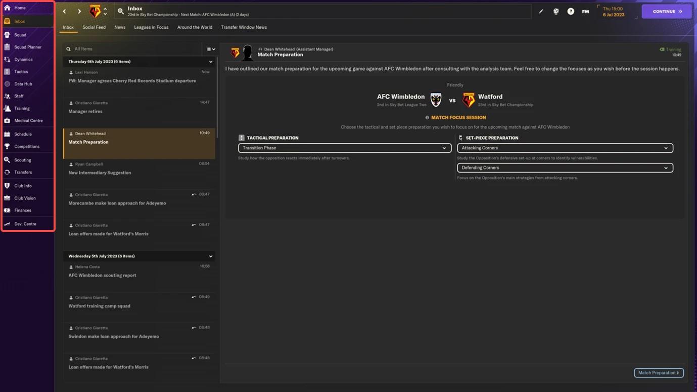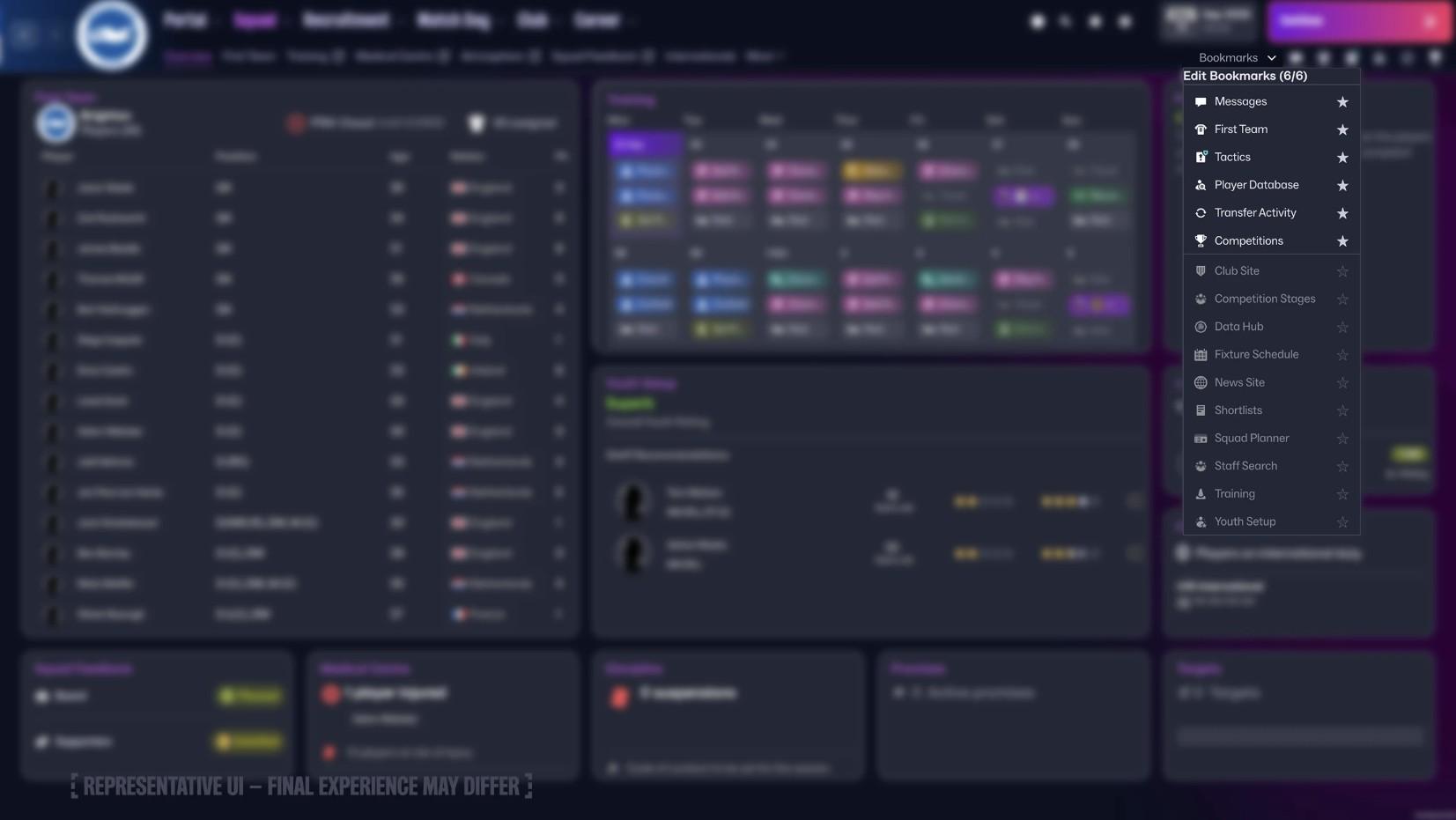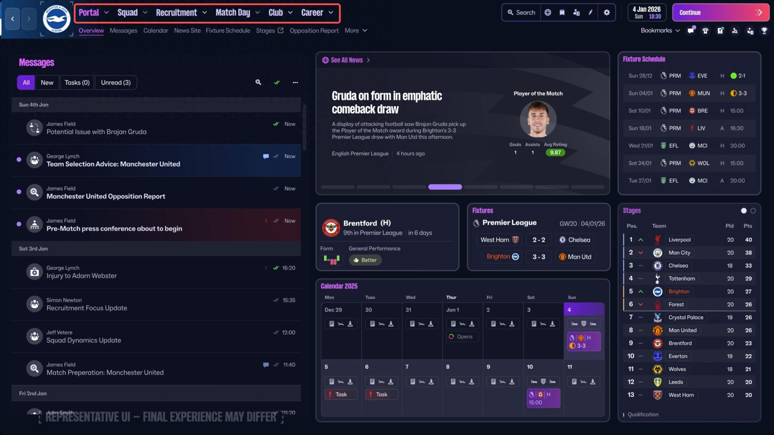 另一個顯著的變化是收件箱被整合進首頁當中,郵件系統被清晰地劃分爲“任務”和“未讀”兩類,只需要處理完標記爲“任務”的關鍵郵件(即過去被標紅的郵件內容),即可繼續遊戲,而其他未讀郵件則需要手動進行查看。官方給全新的主頁命名爲“經理中心”,採用模塊化設計,將賽事與日常的相關信息整合進一頁之中,這也意味着這可能成爲FM26中玩家打交道最多的界面。
