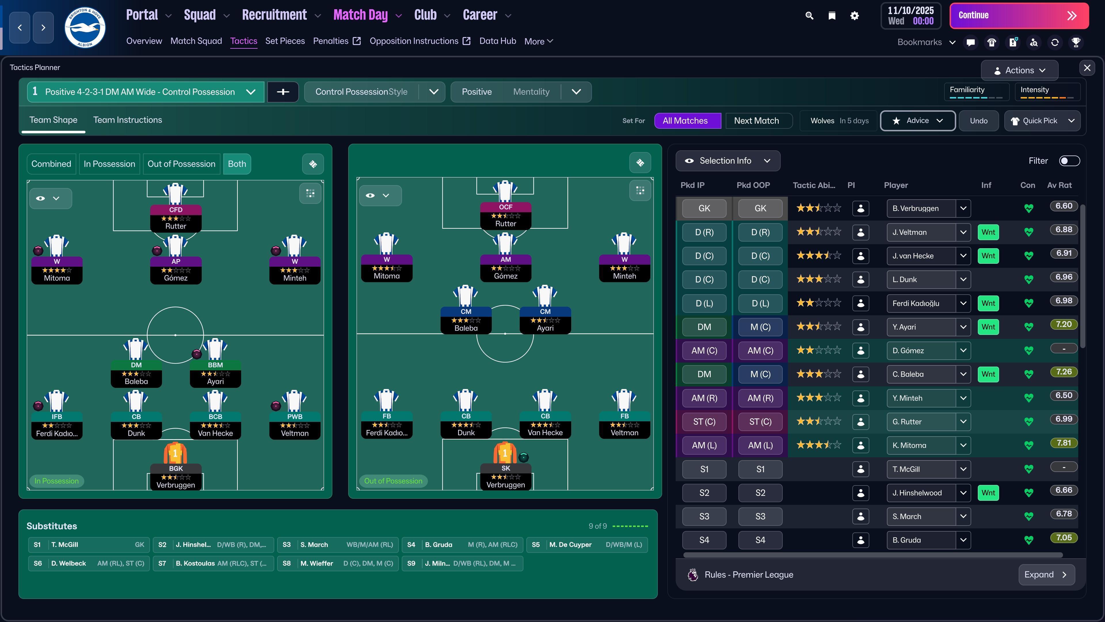 試玩過後,筆者感受到本作最核心的改動其實是在戰術層面,這也是讓FM26在本質上區別於之前作品的地方。FM26的戰術頁不再只是單一的一套陣容,而是引入了獨立的“持球陣型”和“無球陣型”設置,允許經理爲球隊在不同比賽階段配置完全獨立的陣型。