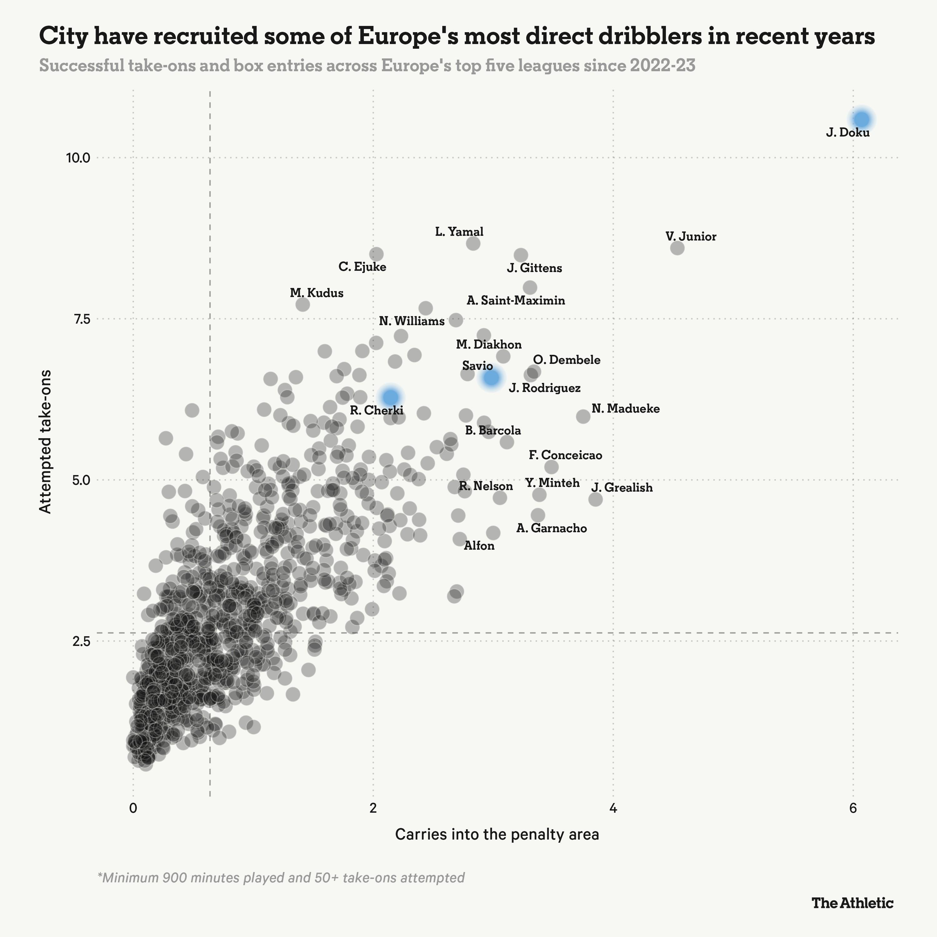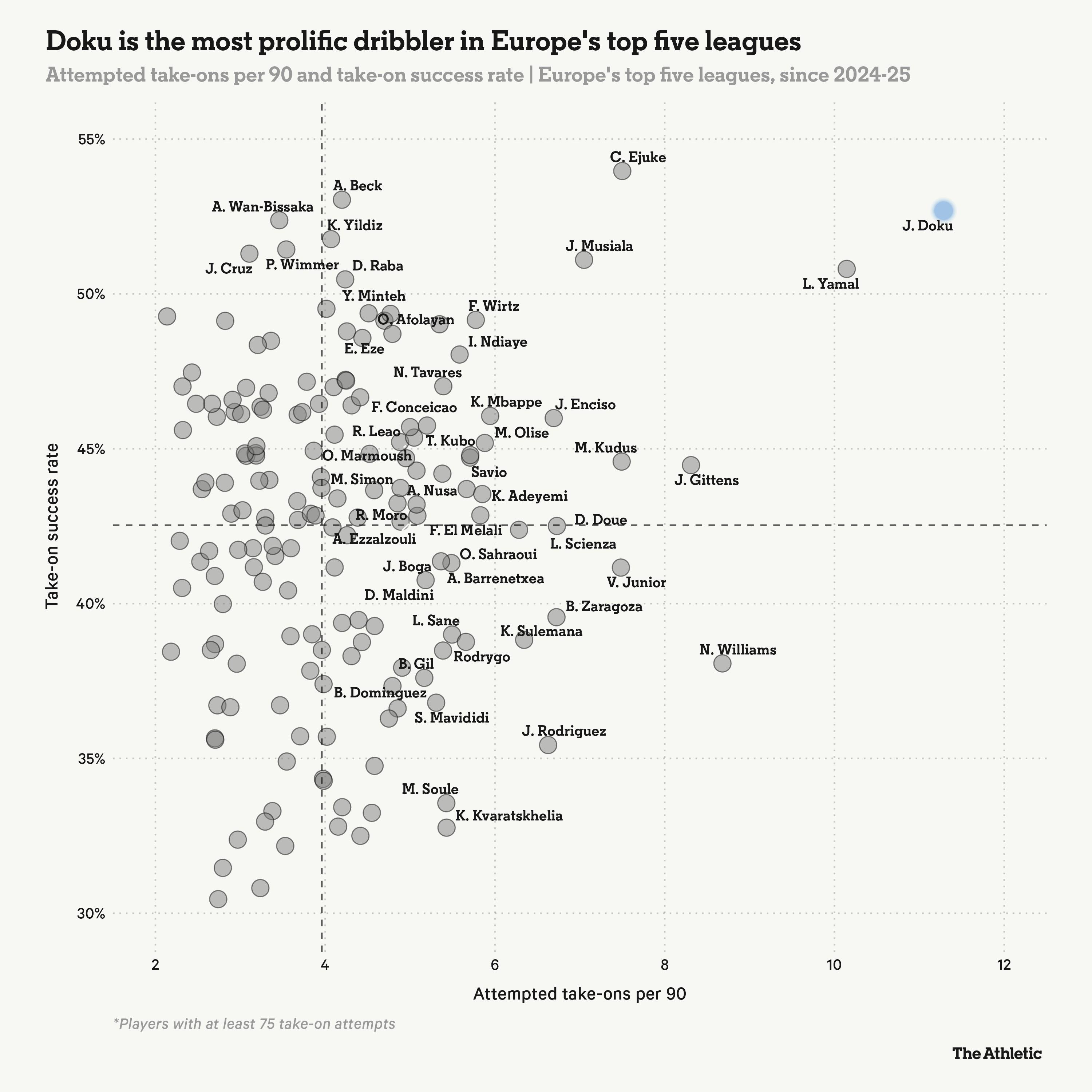 自上賽季開始以來,在歐洲五大聯賽中,在所有完成超過75次成功過人的球員裏,沒有人的場均嘗試過人次數(每90分鐘11.3次)或成功過人次數(每90分鐘6次)比多庫更多。