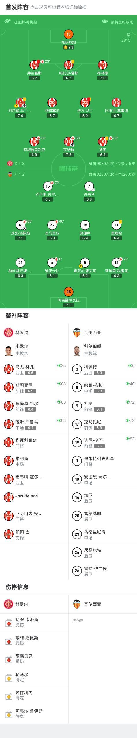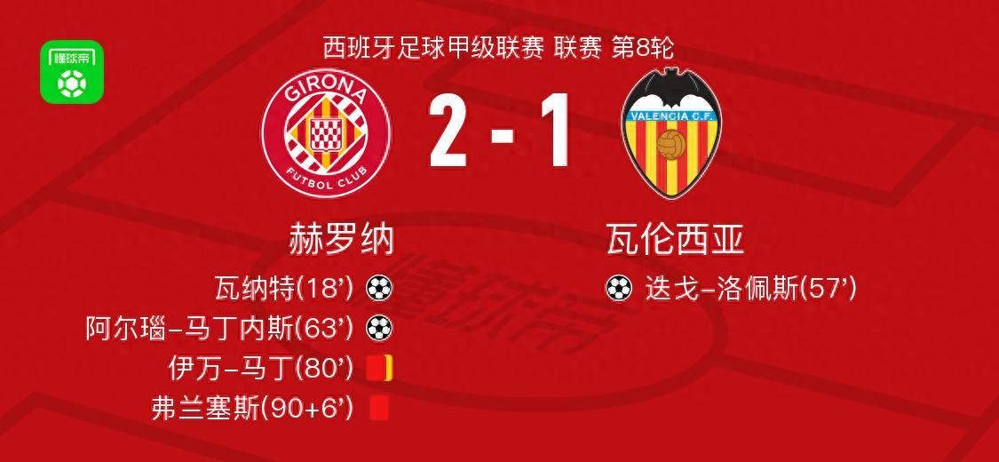 北京時間10月4日西班牙足球甲級聯賽 聯賽 第8輪,赫羅納主場對陣瓦倫西亞。赫羅納瓦納特破門,阿爾瑙-馬丁內斯破門。瓦倫西亞迭戈-洛佩斯破門。最終比分赫羅納 2-1 瓦倫西亞。