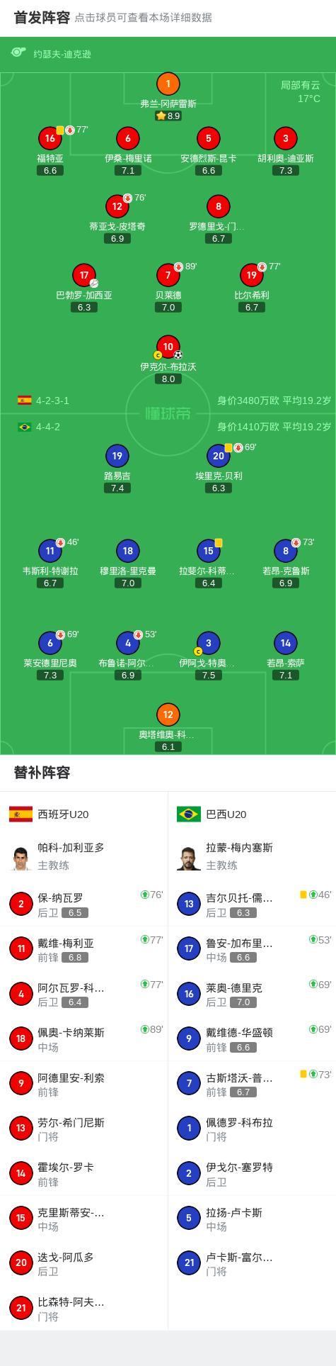 北京時間10月5日U20世界盃 小組賽 第3輪,西班牙U20對陣巴西U20。西班牙U20伊克爾-布拉沃破門。最終比分西班牙U20 1-0 巴西U20。