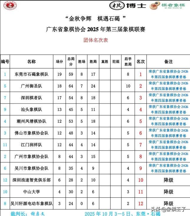 經過激烈的角逐,深圳浪速智競俱樂部隊(領隊彭宇超[兼],教練梁瀚琛[兼],棋手許珍浩、吳昊宇、林燦峯),中山大學隊(譚琳琳[兼],教練李鋒[兼],隊員曾鈞躍、江寧、林俊達、高劭傑),吳川軒源電動車象棋隊(領隊歐華,棋手李冠明、陳偉斌、陳培浪、龐才良、黃炫霖),三支隊伍稍後幾分,遺憾降級。