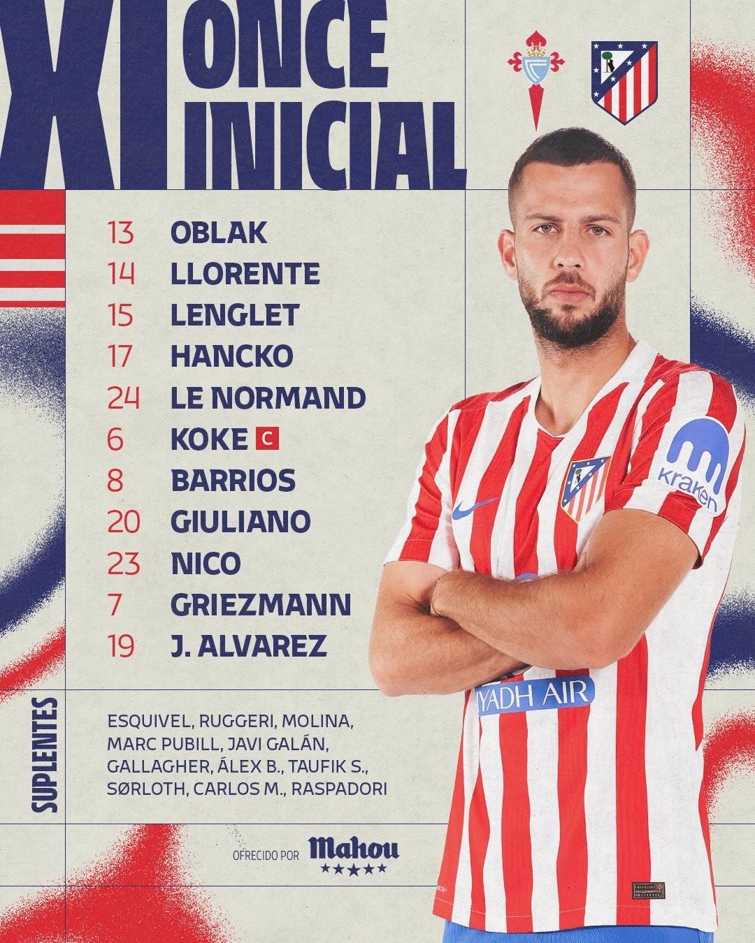 馬競首發:13-奧布拉克、14-馬科斯-略倫特、24-勒諾爾芒、15-朗格萊、17-漢茨科、23-尼古拉斯-岡薩雷斯、6-科克、8-巴勃羅-巴里奧斯、20-朱利亞諾-西蒙尼、19-阿爾瓦雷斯、7-格列茲曼