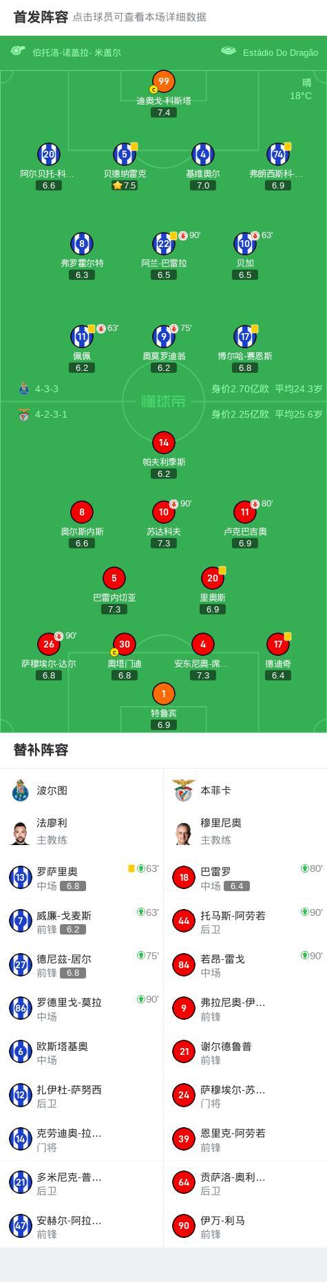 北京時間10月6日葡萄牙足球超級聯賽 聯賽 第8輪,波爾圖主場對陣本菲卡。最終比分波爾圖 0-0 本菲卡。