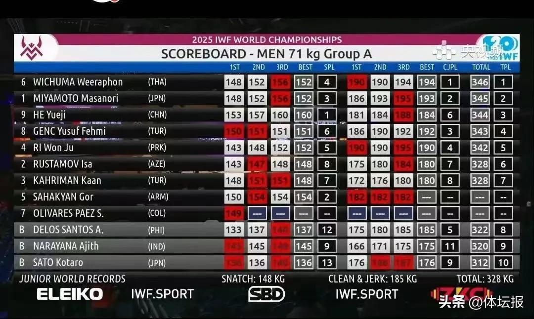 北京時間10月6日,在挪威福德舉行的2025年世界舉重錦標賽男子71公斤級決賽上演破紀錄大戰——4人共9次打破世界紀錄!