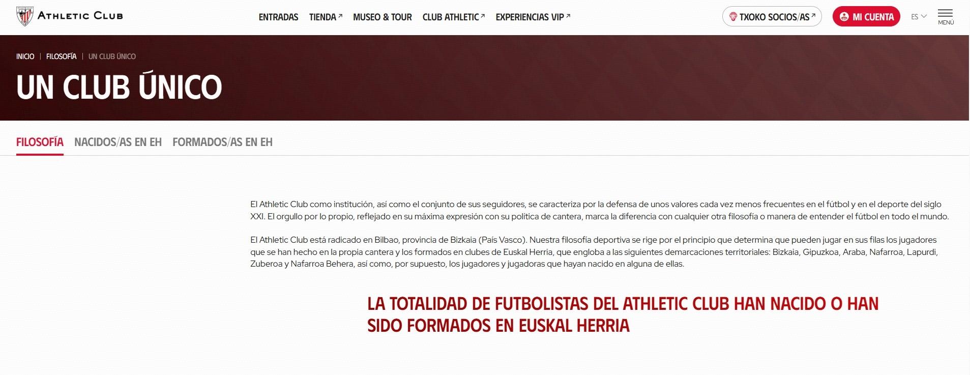 關於自己的選人用人原則,畢爾巴鄂競技在官網上是這樣寫的:“我們的體育理念遵循以下原則:只有出自我們青訓營的球員,以及在巴斯克地區,包括以下地區:比斯開、基普斯誇、阿拉瓦(巴斯克自治區的三個省)、納瓦拉(西班牙自治區,也是巴斯克地區之一)、拉普爾迪、蘇貝羅阿和下納瓦拉(法國巴斯克地區)的俱樂部訓練的球員,以及出生在這些地區的球員,才能加入我們的隊伍。”