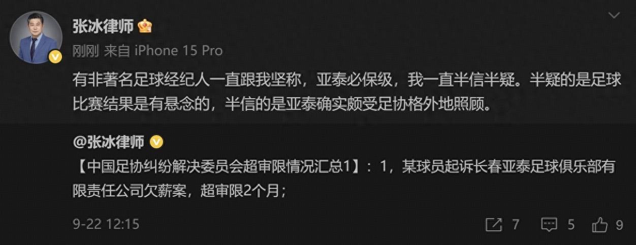 此前在9月22日,律師張冰曾在社交媒體上表示,某球員起訴長春亞泰欠薪,此案已經超過了審結案件的期限長達兩個月之久。