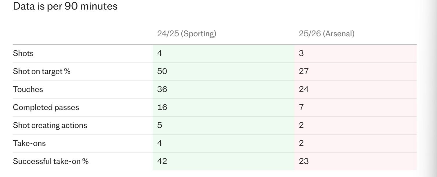 在葡萄牙,他常常通過帶球衝擊後衛來折磨他們,場均超過4次“向前推進盤帶”。而在阿森納至今,他場均只有1次向前推進盤帶。