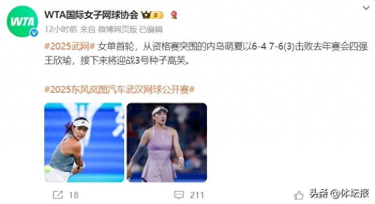 10月6日,2025武漢網球公開賽女單首輪,從資格賽突圍的內島萌夏以6-4 7-6(3)擊敗去年賽會四強王欣瑜,前者接下來將迎戰3號種子高芙。