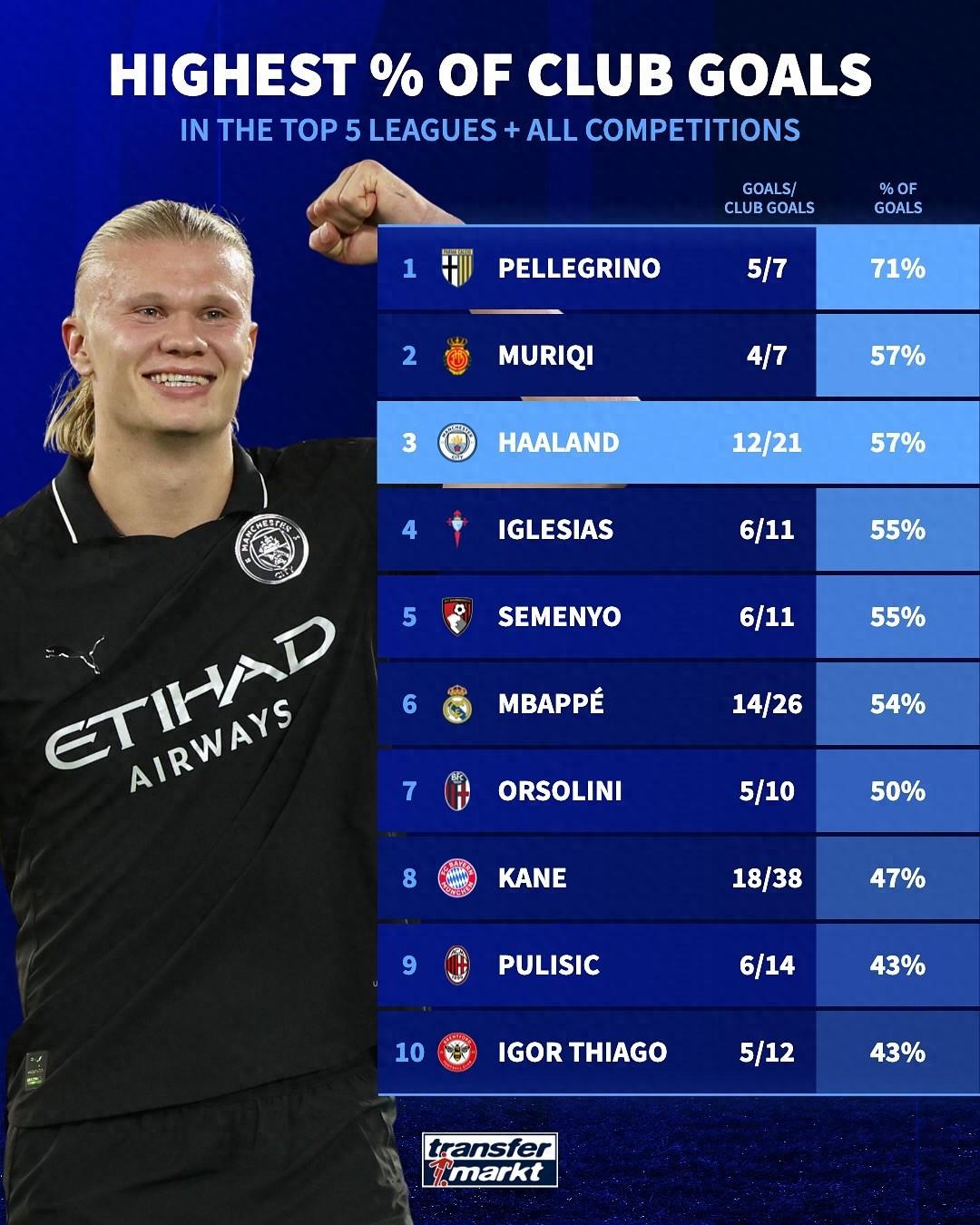 德國轉會市場網站列出了本賽季五大聯賽球員進球佔球隊總進球比例排行榜,打入12球的哈蘭德以57%排名第三。