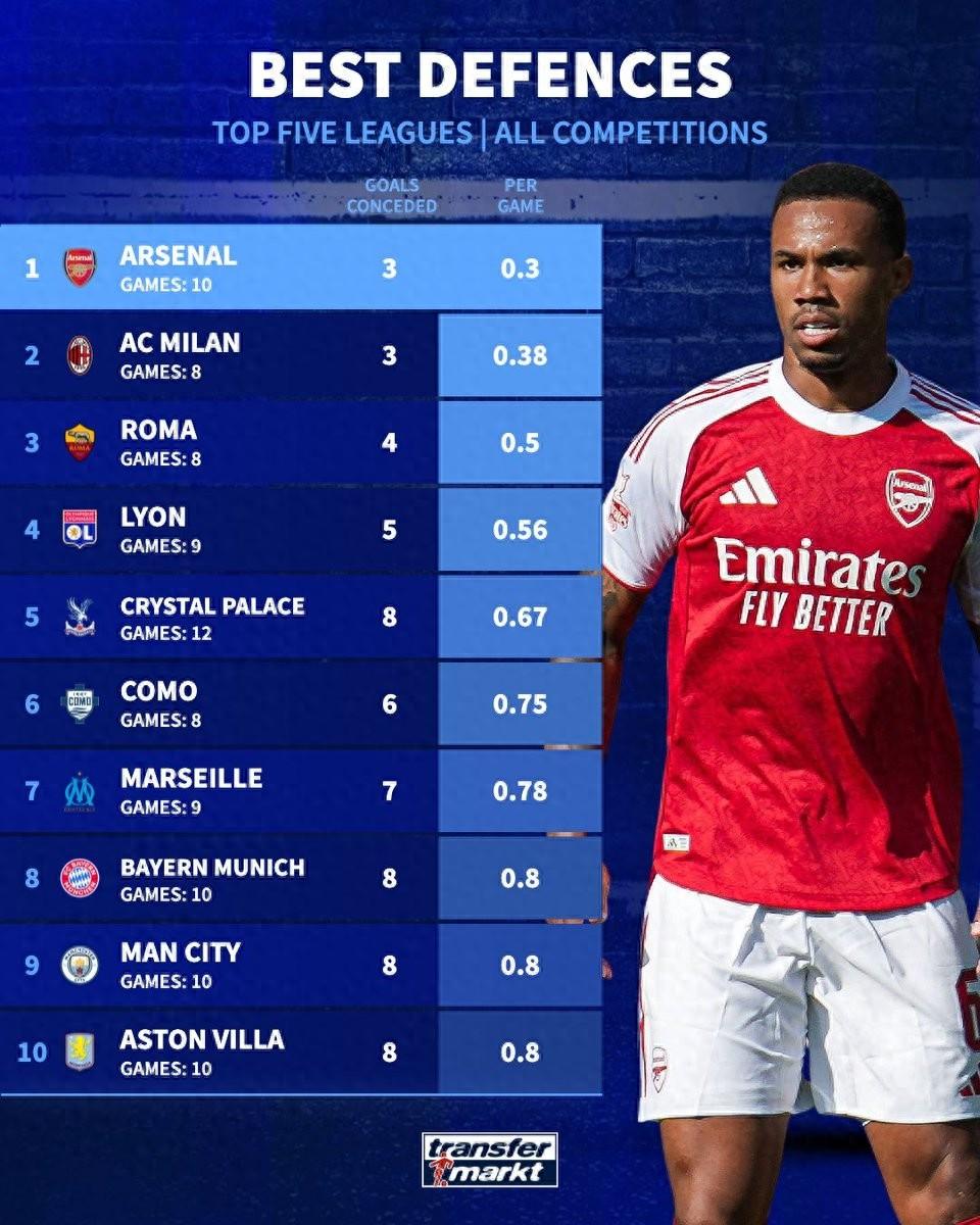 德國轉會市場網站列出了本賽季五大聯賽球隊各項賽事場均丟球最少排行榜,阿森納以0.3球排名第一,米蘭第二,羅馬第三。