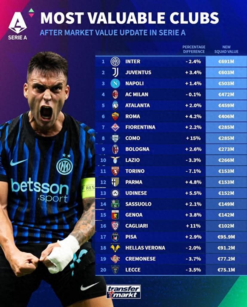 北京時間10月7日,在更新了意甲球員的身價之後,德轉還列出了此次更新後意甲俱樂部總身價的漲幅情況以及具體排名,國際米蘭以6.91億歐元排名第一,隨後分別是尤文圖斯、那不勒斯以及AC米蘭。