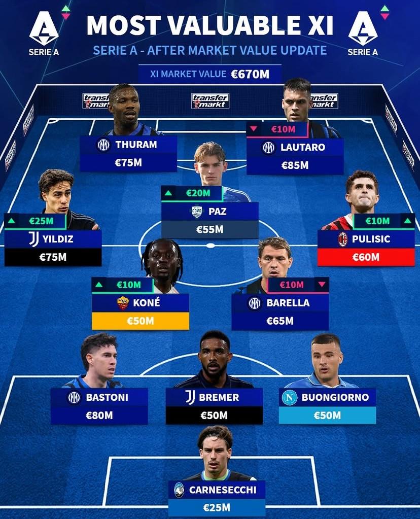 普利希奇(AC米蘭)6000萬歐元、巴雷拉(國際米蘭)6500萬歐元、尼科-帕斯(科莫)5500萬歐元、誇迪奧-科內(羅馬)5000萬歐元、凱南-伊爾迪茲(尤文圖斯)7500萬歐元