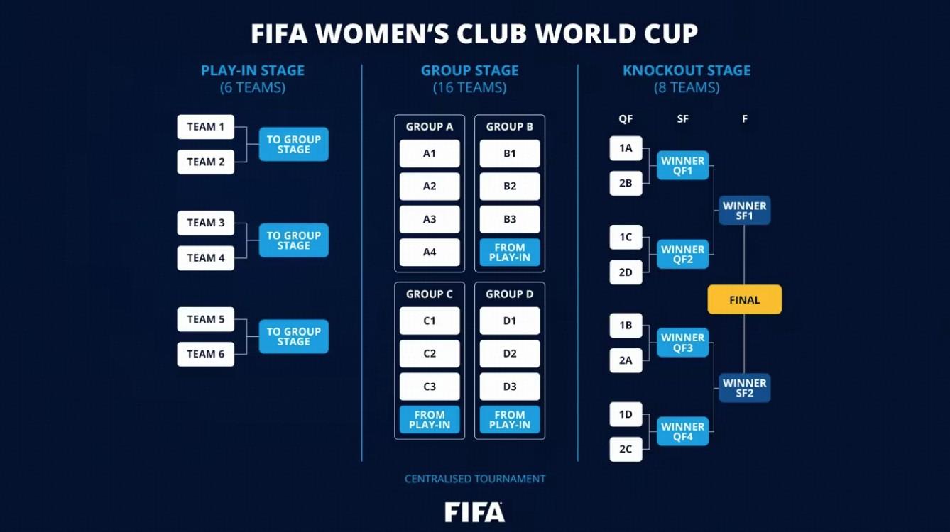 FIFA女足冠軍盃相當於男足裏新版的FIFA洲際盃。2028年,國際足聯女足世俱杯將首次舉辦,四年一度,相當於男足裏新版的世俱杯,由來自全球的19傢俱樂部參賽,16傢俱樂部進行正賽。