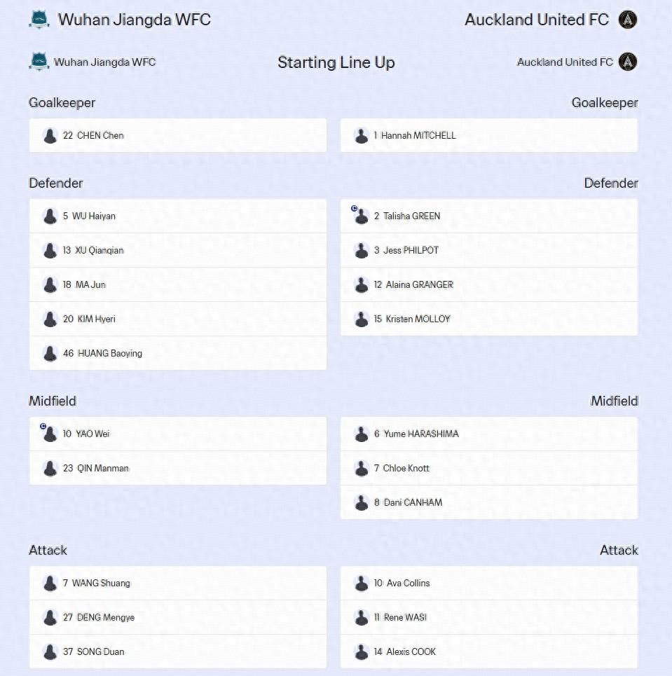 北京時間10月8日16:00,FIFA女冠杯第一輪,武漢車谷江大女足主場對陣奧克蘭聯女足。賽前首發公佈。
