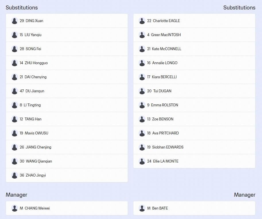 替補:4-格里爾-麥金託什、9-羅爾斯頓、13-本森、16-安娜莉-隆哥、17-貝爾切利、18-阿娃-普理查德、19-愛德華茲、20-杜根、21-麥康奈爾、22-伊格爾、24-拉蒙特