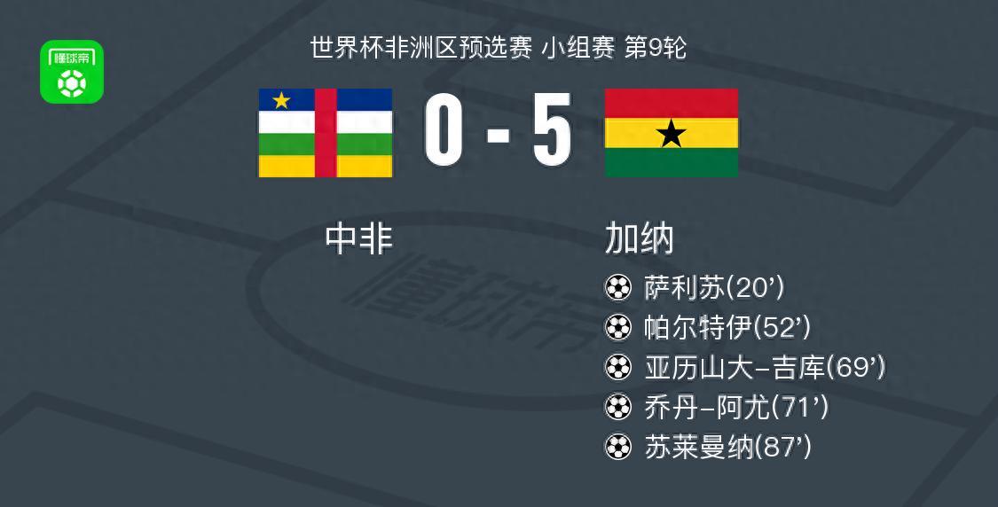 北京時間10月9日,世界盃非洲區預選賽小組賽第9輪,中非迎戰加納。比賽中,庫杜斯送出助攻,薩利蘇率先打破僵局。隨後,喬丹-阿尤貢獻一次助攻,帕爾特伊接應破門,進一步擴大領先優勢。喬丹-阿尤再次送出精準傳球,亞歷山大-吉庫冷靜施射得手。緊接着,喬丹-阿尤親自建功,將比分繼續改寫。比賽尾聲階段,潘特希爾助攻蘇萊曼納破門,爲球隊鎖定勝局。最終,加納以5比0戰勝中非。