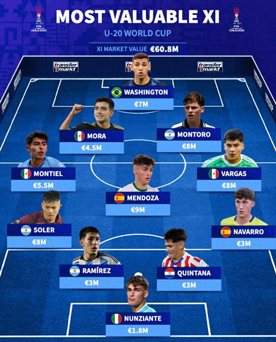 北京時間10月10日,德轉列出了本屆U20世界盃的最貴11人陣容,西班牙U20中場,目前效力於埃爾切的羅德里戈-門多薩以900萬歐元的身價領銜,阿根廷隊陣中的伯恩茅斯左後衛胡利安-索萊爾和巴西隊陣中的切爾西前鋒戴維德-華盛頓在列。
