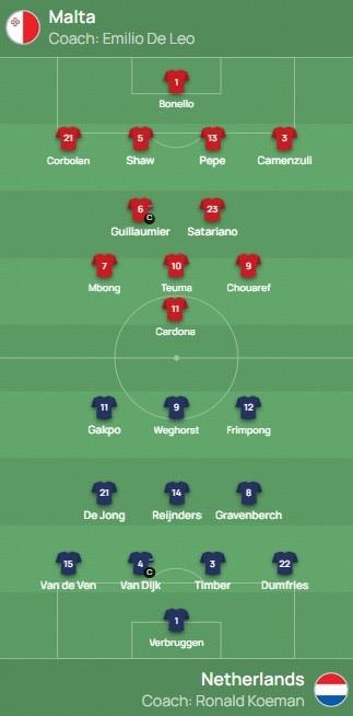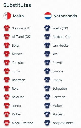 北京時間10月10日02:45,歐洲預選第一階段小組賽第7輪展開較量,馬耳他對陣荷蘭。賽前雙方首發公佈。