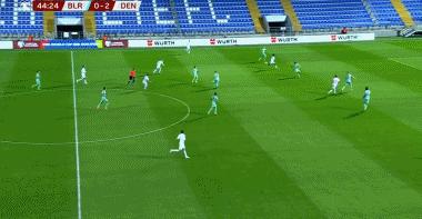 第45分鐘,多古打門被撲,霍伊倫再次空門喫餅,丹麥3-0領先