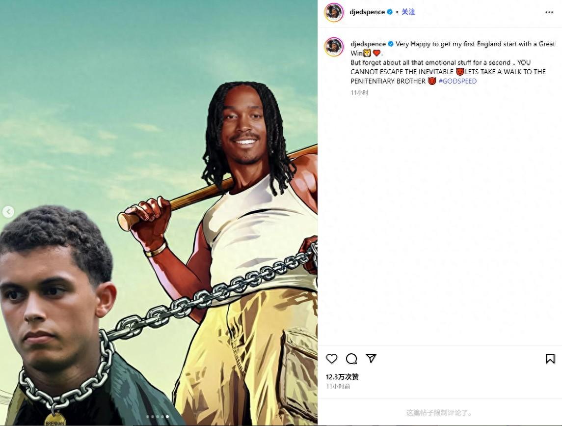 比賽結束後,斯彭斯在社交媒體上發表動態,並配文:“非常高興在英格蘭隊首次首發並取得一場精彩的勝利♥️。但先把這些情感放在一邊……你無法逃避不可避免的事情,兄弟,讓我們去牢裏走一趟吧。”