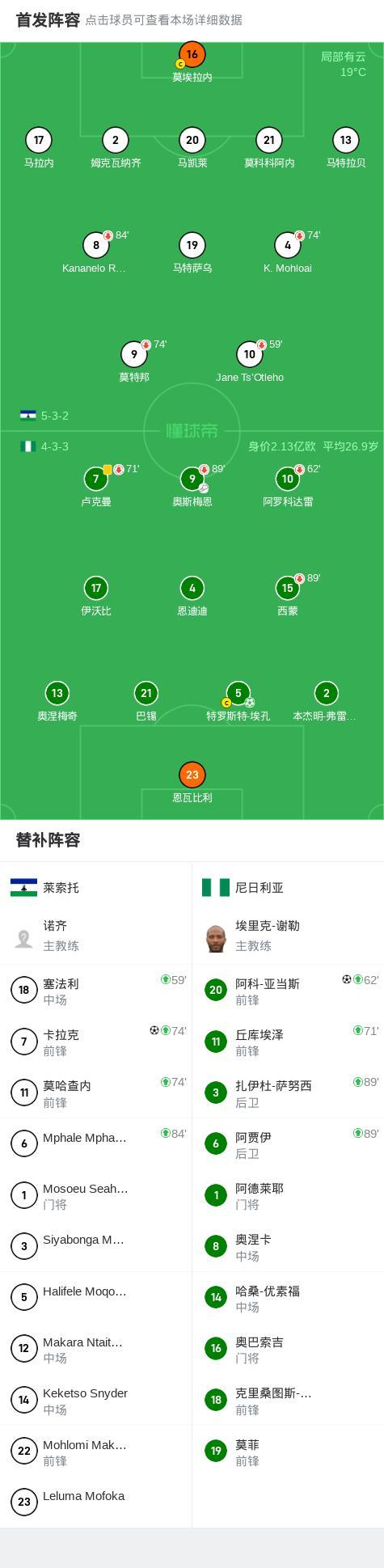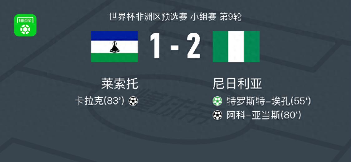 在世界盃非洲區預選賽小組賽第9輪的一場較量中,萊索托與尼日利亞展開對決。比賽中,尼日利亞球員特羅斯特-埃孔通過點球爲球隊取得領先。隨後,奧斯梅恩送出助攻,阿科-亞當斯接球后破門得分,幫助球隊擴大優勢。比賽後段,萊索托球員卡拉克抓住機會攻入一球,爲球隊扳回一分。最終,全場比分定格爲1-2,尼日利亞戰勝對手。