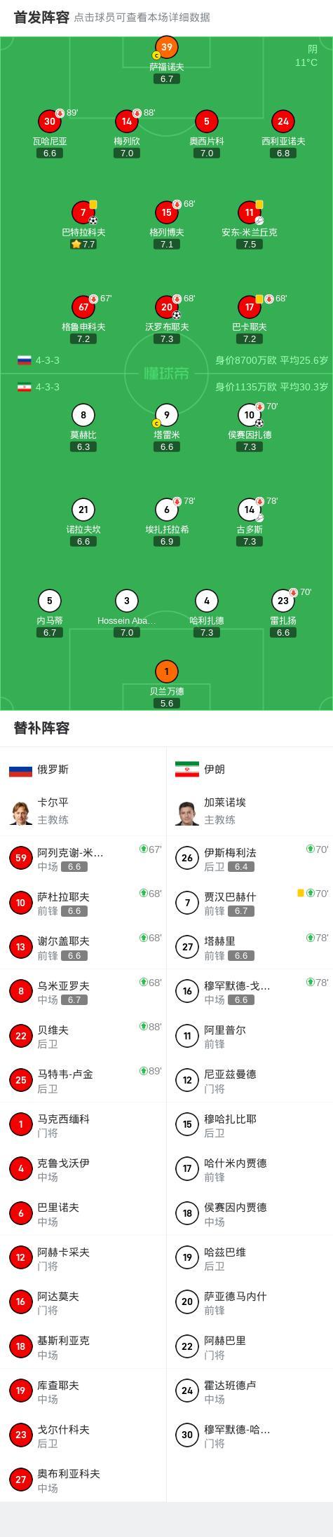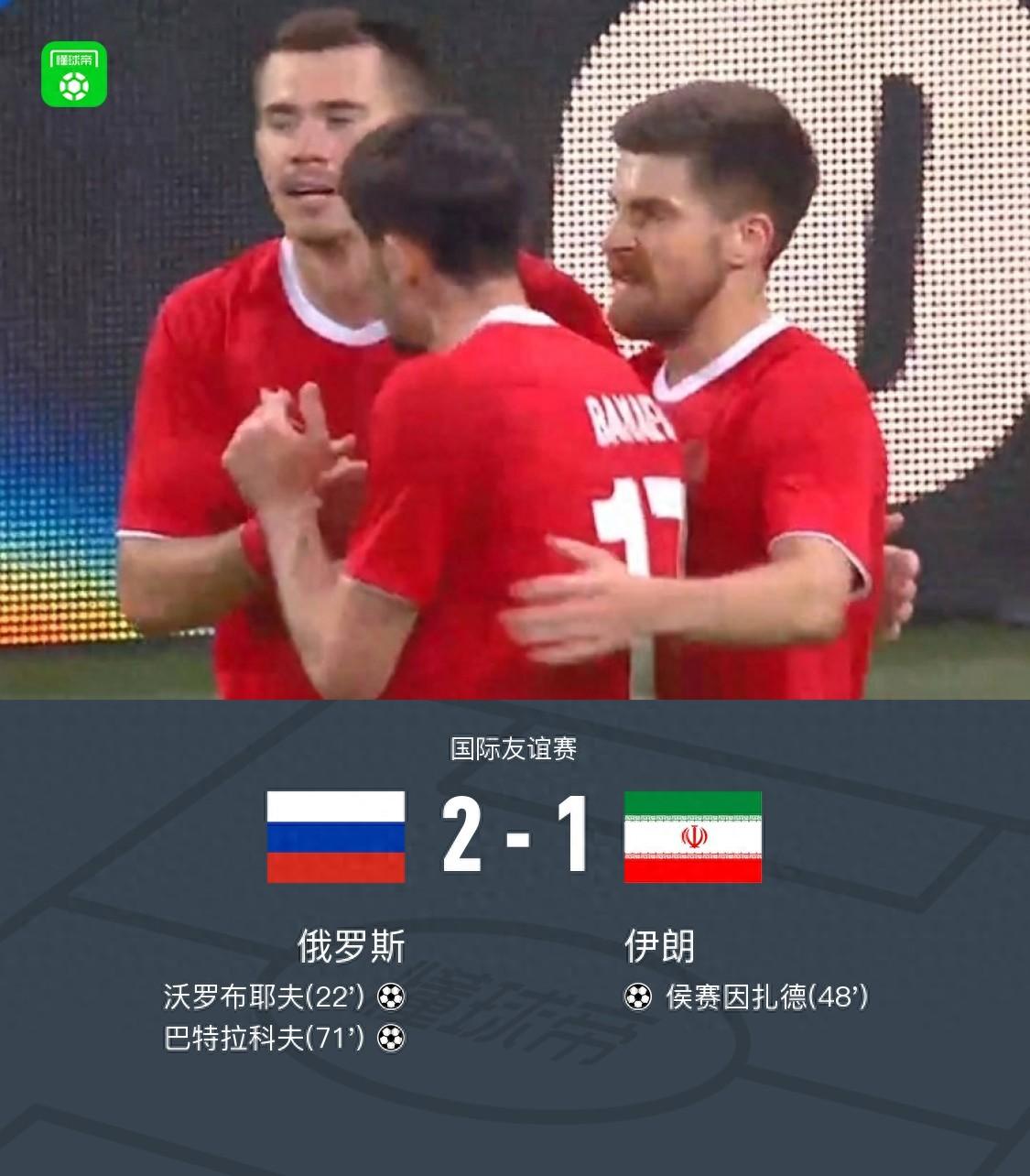 北京時間10月11日國際友誼賽,俄羅斯對陣伊朗。俄羅斯沃羅布耶夫破門,巴特拉科夫破門。伊朗侯賽因扎德破門。最終比分俄羅斯 2-1 伊朗。