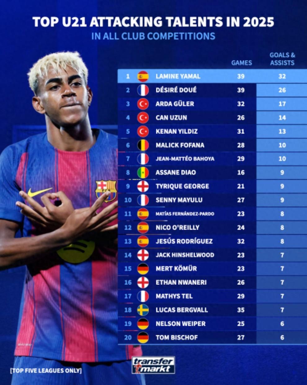 五大聯賽U21球員25年直接參與進球排名:亞馬爾39場造32球第1