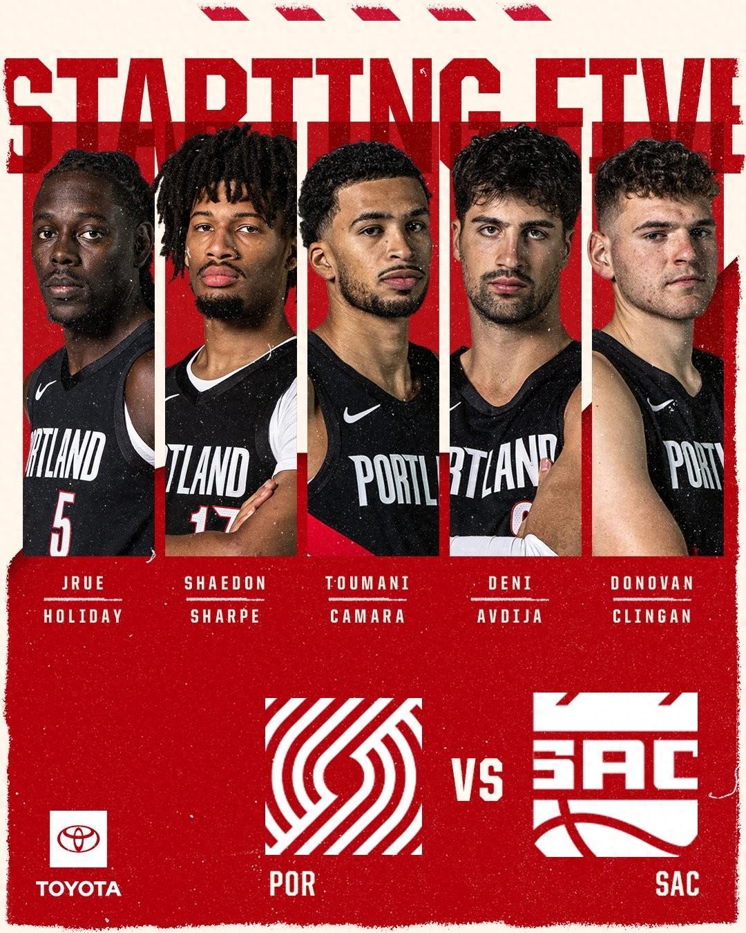開拓者的首發名單與上一場對陣勇士的名單相同,具體爲:朱-霍勒迪、謝登-夏普、圖馬尼-卡馬拉、德尼-阿夫迪亞和多諾萬-克林根。楊瀚森本場將繼續替補出戰。