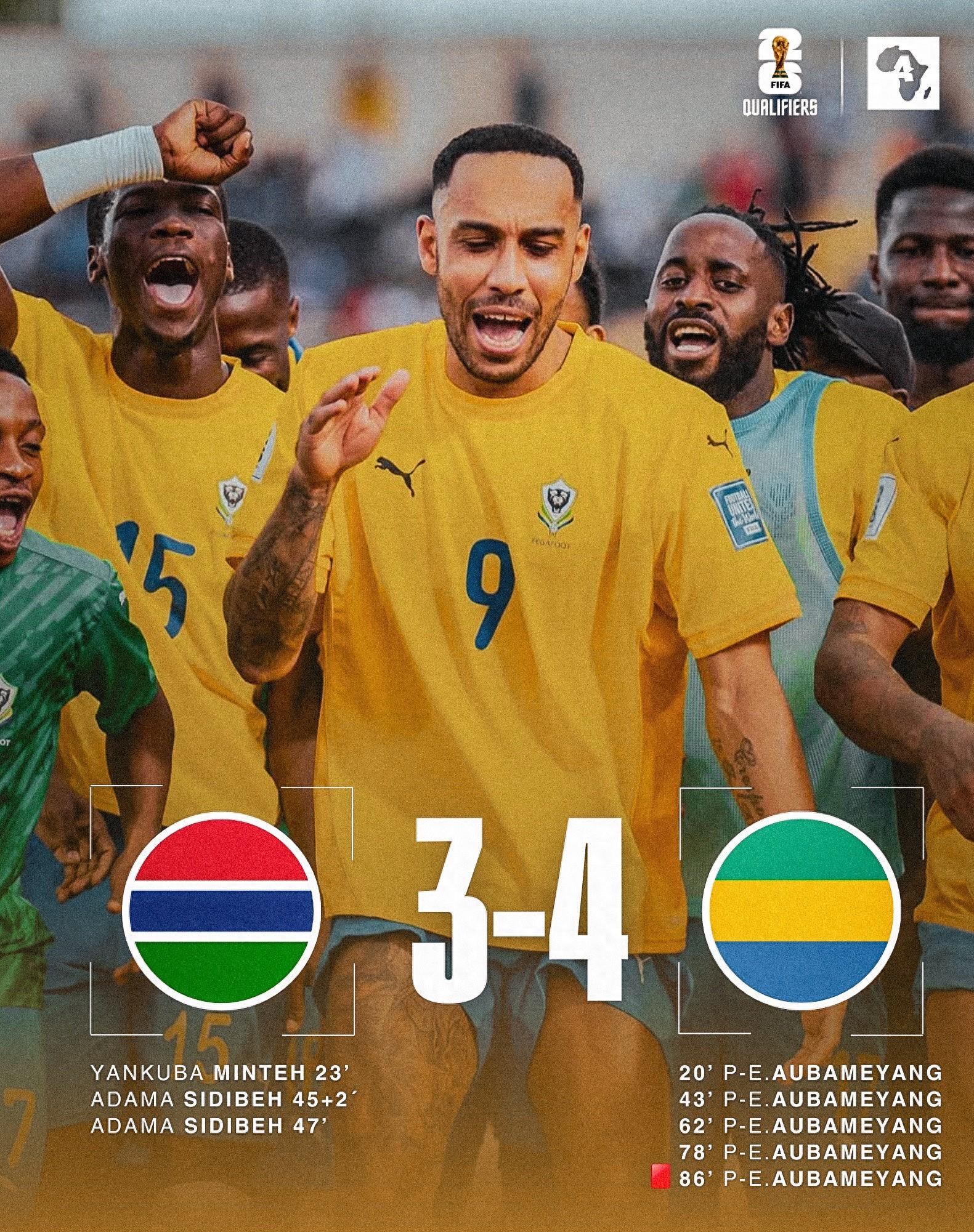 第42分鐘,加蓬門將姆巴巴長傳,奧巴梅揚單刀破門完成雙響,加蓬2-1岡比亞