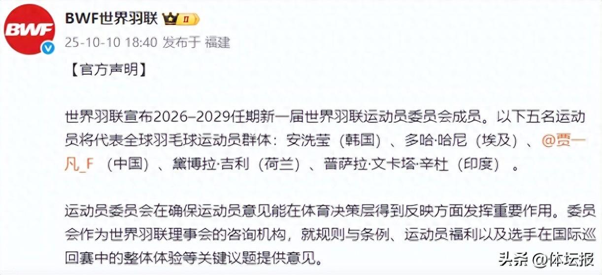 新陣容官宣,賈一凡入選世界羽聯運動員委員會
