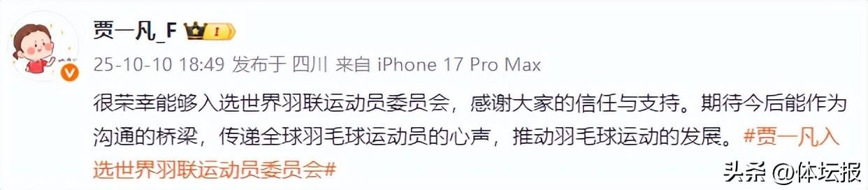 隨後,賈一凡發文回應:“很榮幸能夠入選世界羽聯運動員委員會,感謝大家的信任與支持。期待今後能作爲溝通的橋樑,傳遞全球羽毛球運動員的心聲,推動羽毛球運動的發展。”
