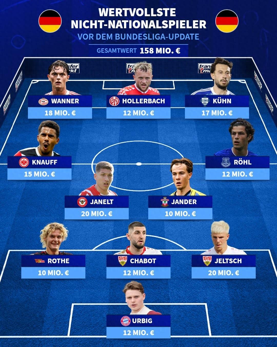 北京時間10月11日,德轉統計出了從未入選過德國成年國家隊的現役最貴德國11人陣容,布倫特福德中場雅內爾特以及斯圖加特後衛耶爾奇以2000萬歐元的身價領銜,拜仁慕尼黑的門將烏爾比希以及今夏轉會埃因霍溫的保羅-萬納在列。