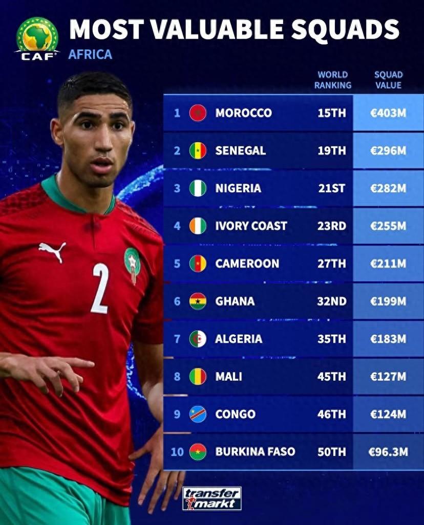 北京時間10月12日,德轉統計出了非洲國家隊中目前身價排名前10的球隊,摩洛哥隊以4.03億歐元的身價高居第一,塞內加爾2.96億歐元第二,尼日利亞2.82億歐元第三。