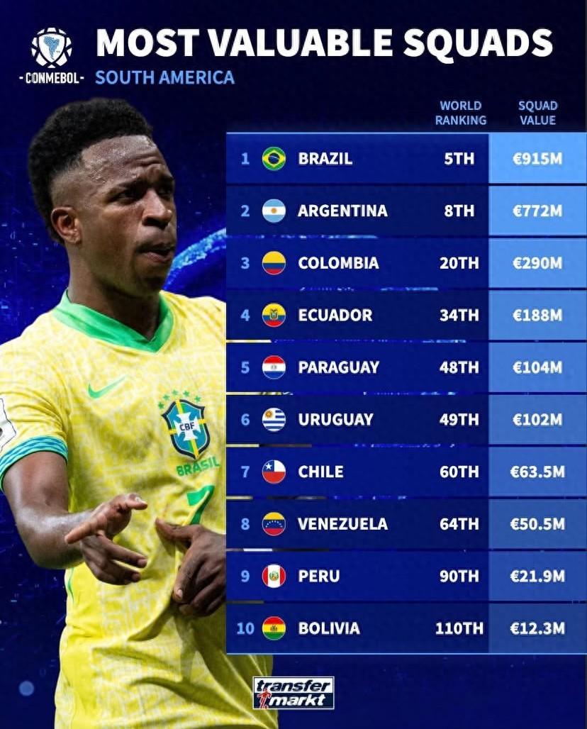 北京時間10月12日,德轉統計出了目前南美10支國家隊的身價排名,巴西隊以9.15億歐元的身價高居第一,阿根廷7.72億歐元第二,哥倫比亞2.9億歐元第三。